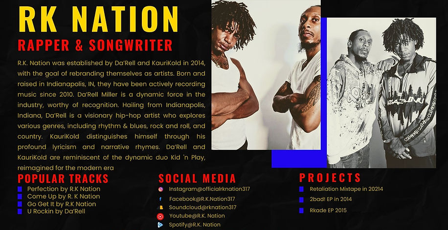 R.K. Nation was established by Da’Rell and KauriKold in 2014, with the goal of rebranding themselves as artists. Born and raised in Indianapolis, IN, they have been actively recording music since 2010. Da’Rell Miller is a dynamic force in the industry, worthy of recognition. Hailing from Indianapolis, Indiana, Da’Rell is a visionary hip-hop artist who explores various genres, including rhythm & blues, rock and roll, and country. KauriKold distinguishes himself through his profound lyricism and narrative rhymes. Da’Rell and KauriKold are reminiscent of the dynamic duo Kid 'n Play, reimagined for the modern era.